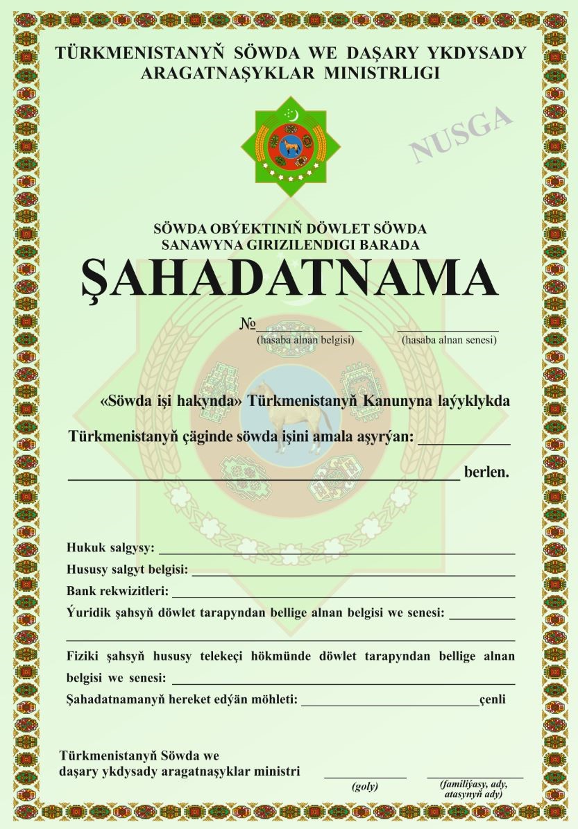 Söwda obýektleri döwlet söwda sanawyna hasaba almak üçin gerekli resminamalar: